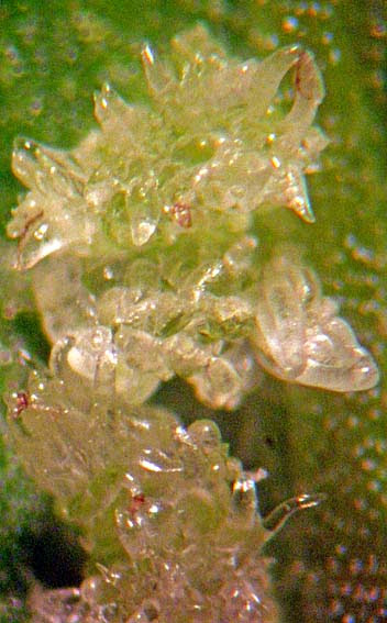 ..... they turned out to be clusters of swollen, glassy secretory hairs, known botanically as colleters. They're present on upper and lower leaf surfaces.