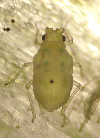 ... small colonies of to these tiny aphids. Even though they are held fast, they can still use their piecing mouthparts to puncture the plant's cells and feed, and survive long enough to produce the next generation of young, which are born by virgin birth (parthenogenesis) without the need for mating. If you double-click on this image for a larger view you'll see a pair of minute claws at the tip of each aphid leg. On most host plants these would allow the aphid to grip the plant surface and walk, but the epidermal cells of butterwort are so smooth and slippery that the claws cannot grip. If you watch under a microscope, you can see the claws simply sliding over the plant surface, so the anchored aphid can do nothing other than feed and breed before it eventually dies, leaving a ghostly shell and a clone of itself behind.