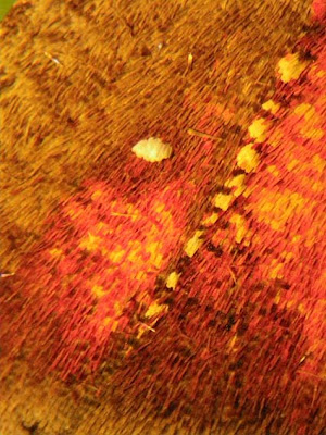 ... much broader, although they vary in width and colour. One interesting feature is that the patches of colour that look fiery orange to the naked eye are composed of a mixture of pinkish-red scales interspersed with variable numbers of yellow scales. The whole effect is reminiscent of colours produced in Pointillist paintings, of the kind made famous by George Seurat. By Seurat's day (1859-1891) the study of colour had revealed that the close juxtaposition of points of two colours could produce the effect of a third colour when viewed from a distance and Seurat exploited this in his meticulously executed paintings. The computer monitor screen that you are viewing this blogpost on uses a similar principle, of coloured dots, to produce its vast range of colours. Butterflies and moths have been exploiting the same phenomenon for millions of years, to either make themselves conspicuous to mates or generate camouflage patterns.
